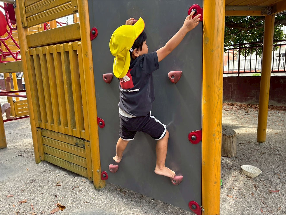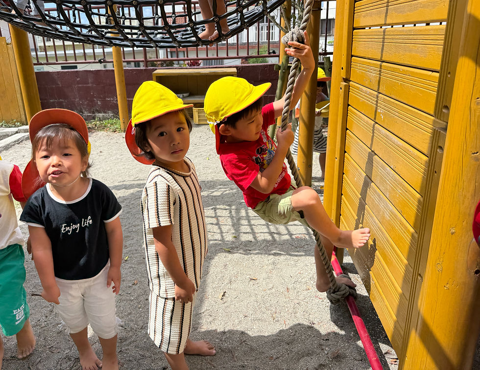 体を動かすことが上手になり、出来るかな?やりたいな!と挑戦する気持ちが育ってきているこども達☆大型遊具のボルダリングではスイスイと登ったり、ヨイショ!と腕の力足の力で上へ↑と駆け上がっていく姿が見られ、「できたよ♪」と嬉しそうに達成感で溢れていました(^^)♡何度でも挫けず挑戦する心!どうしたら出来るのか試して考える力!出来ないお友だちにも手を差し伸べてあげる優しさ!遊びを通して色々な育ちが見られています♡
