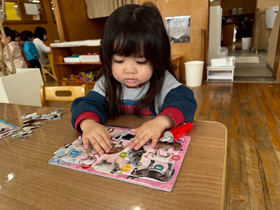 キリン組のお部屋に遊びに行きました!キリン組さんに遊びに行く回数も増え、場所見知りもなく到着するとさっそく散策を楽しむこども達♪各コーナーを行き来しながらお気に入りの玩具を見つけ夢中で楽しんでいます!「せんせい、みてみて!」とお絵描きしたのを見せてくれたり、完成したパズルを見せアピール(^▽^)/キリン組さんでの好きな遊び、好きな場所を見つけ楽しい時間を過ごすことができました♡