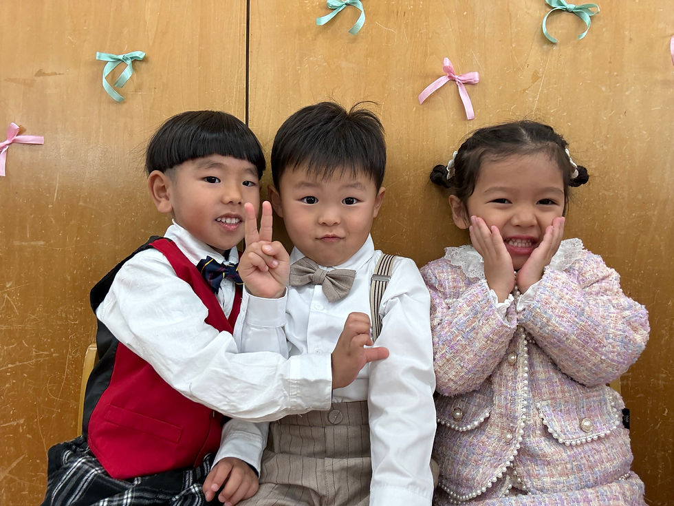 修了記念撮影♪「かわいい おようふく もってきたよ~」「はやく きたいな~」とちょっと特別な日と感じながら朝からウキウキなこども達☆素敵なお洋服に着替えたらお友達同士見せ合いっこをして嬉しそうな表情でキラキラしていました♡