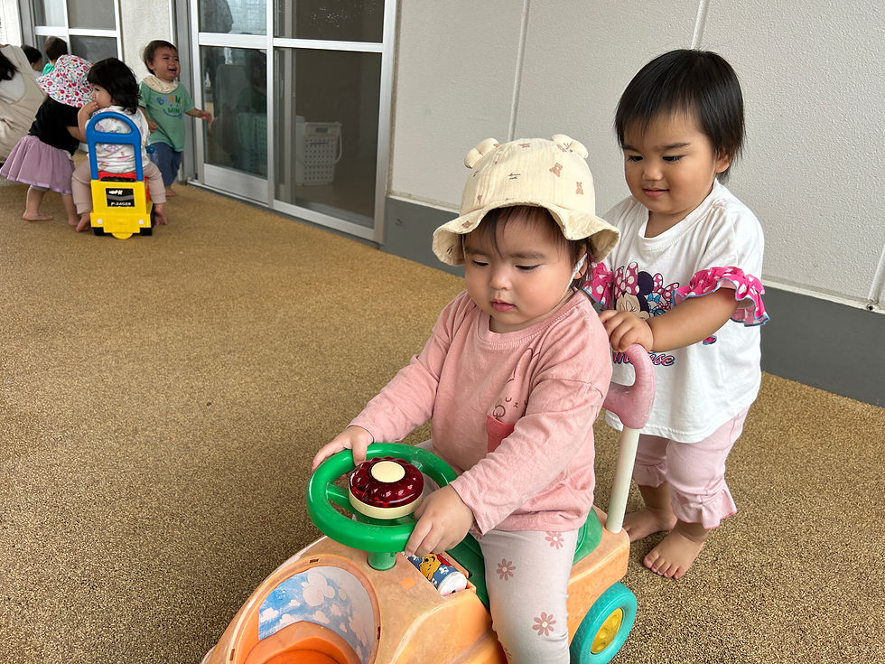 コンビカーに乗るお友だちを押してあげたり、ボールを投げ合ったりと、すっかり仲良くなった2組さんです☆お部屋遊びでも、玩具をお友だちに貸してあげたり、並んで一緒に遊んだりとお友だちへの関心が出てきているようです(^^)v